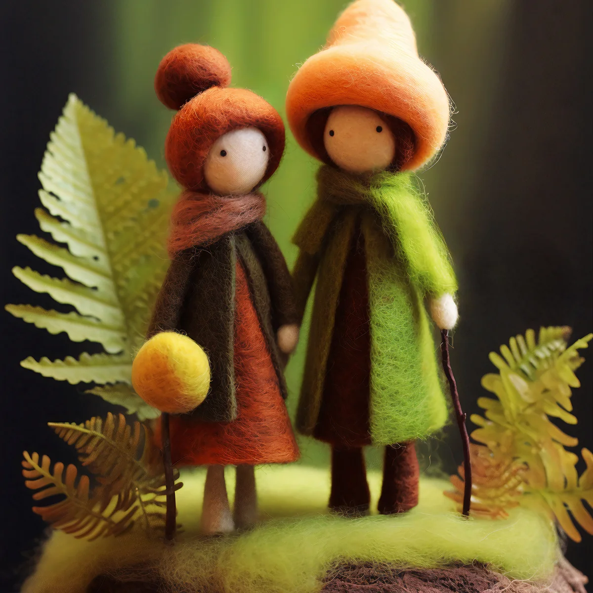 This image shows two whimsical, handcrafted felted wool figures standing on a mossy surface. The figure on the left wears a rust-colored dress, a dark brown coat, a scarf, and a round, burnt-orange hat. It holds a small yellow ball. The figure on the right is dressed in a vibrant green coat, brown pants, a scarf, and a large, floppy orange hat. It holds a thin, dark stick. Both characters have simple, featureless faces and are surrounded by lush green ferns and other forest-like foliage. The background is a soft, out-of-focus green and dark brown, giving the scene a magical, natural feel.