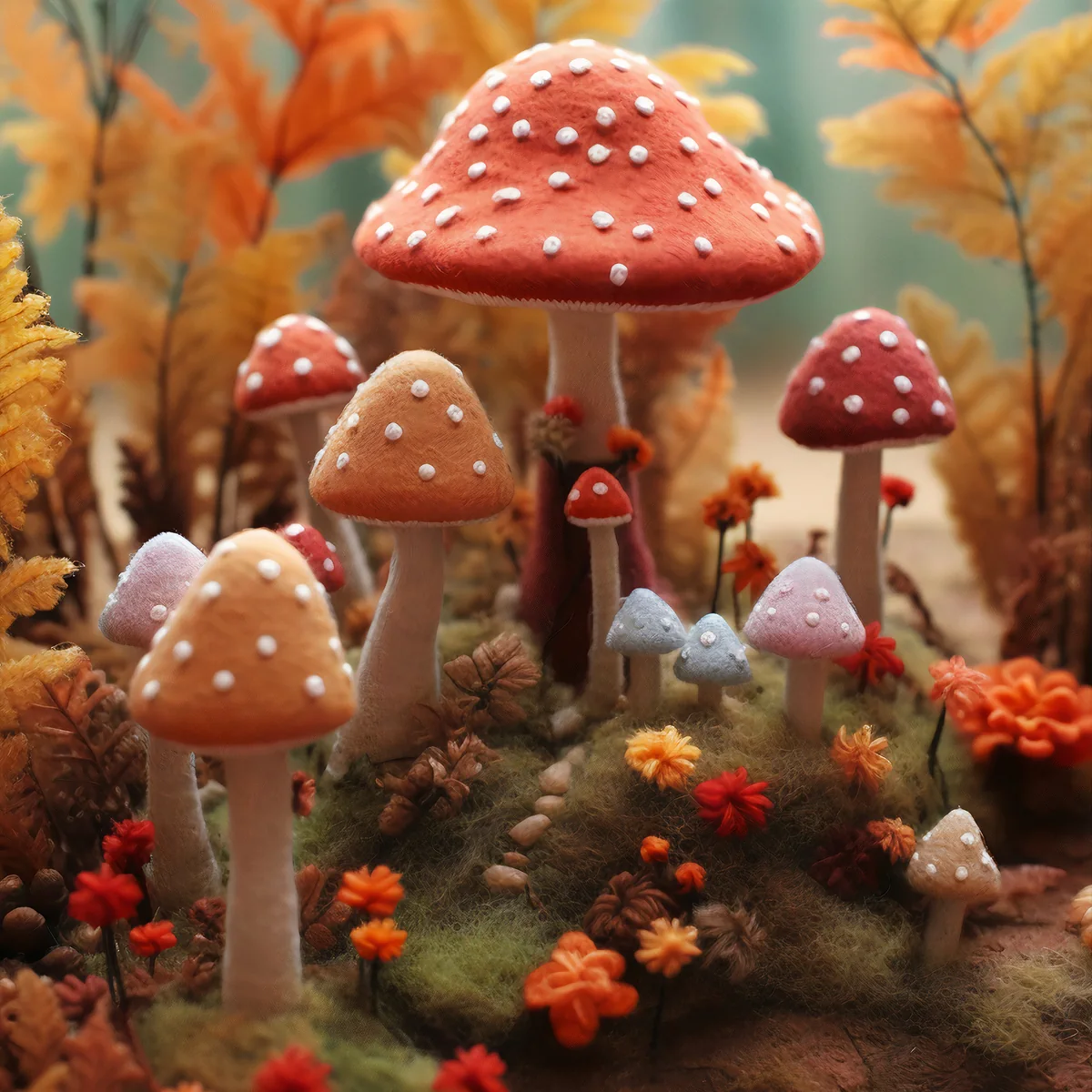 This image features a charming, vibrant scene of felted wool mushrooms and foliage. A large, prominent red and white polka-dotted mushroom with a thick stem dominates the center of the image. It is surrounded by a variety of other mushrooms in different sizes and colors, including orange, speckled red, and soft blue and pink. The scene is set on a mossy mound and is filled with tiny felted flowers in shades of red and orange, as well as autumnal ferns and leaves in the background. The overall impression is one of a magical, miniature woodland.