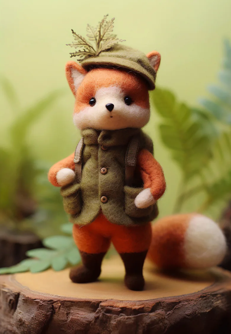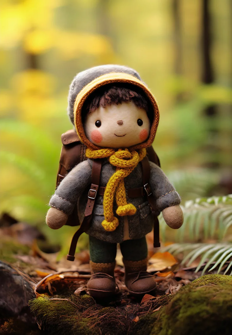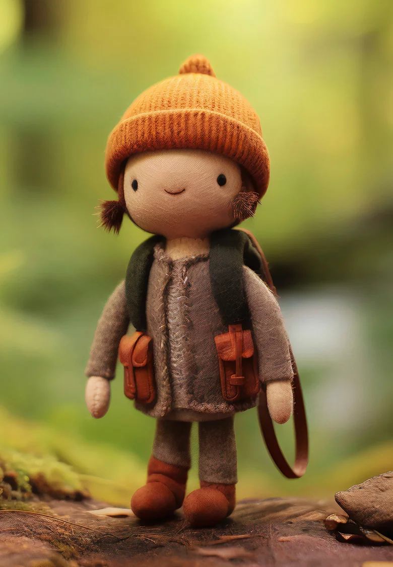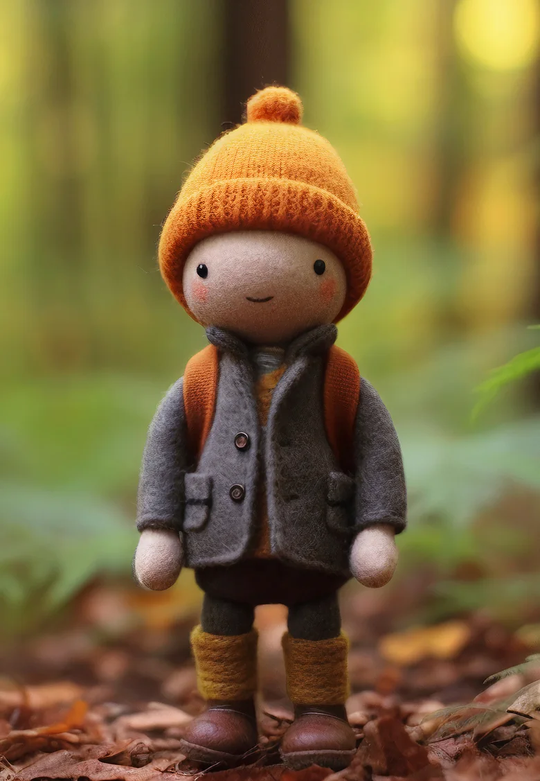 The figure wears a dark gray or brown jacket, brown pants, and a warm, ribbed, burnt-orange beanie. It has a subtle, stitched smile and rosy cheeks, and carries a small backpack with miniature pouches. The figure is standing on a mossy forest floor, with a delicate fern unfurling to its left.